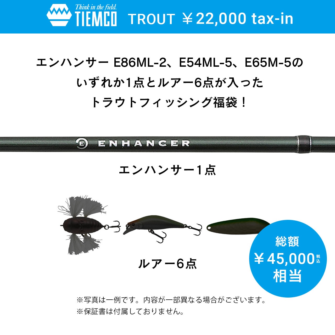 エンハンサー E86ML-2、E54ML-5、E65M-5のいずれか1点とルアー6点が入った総額45,000円(税込)相当のトラウト福袋!