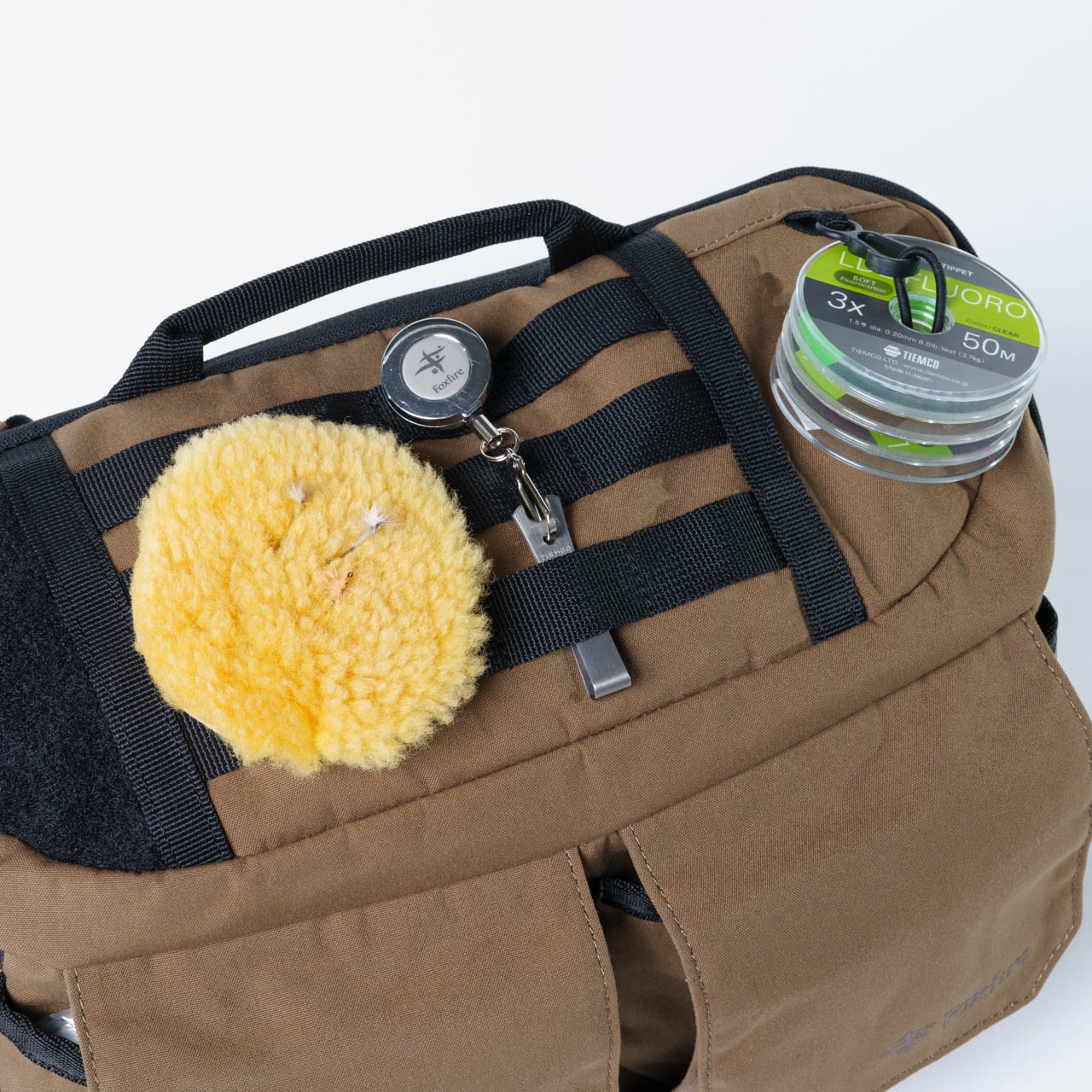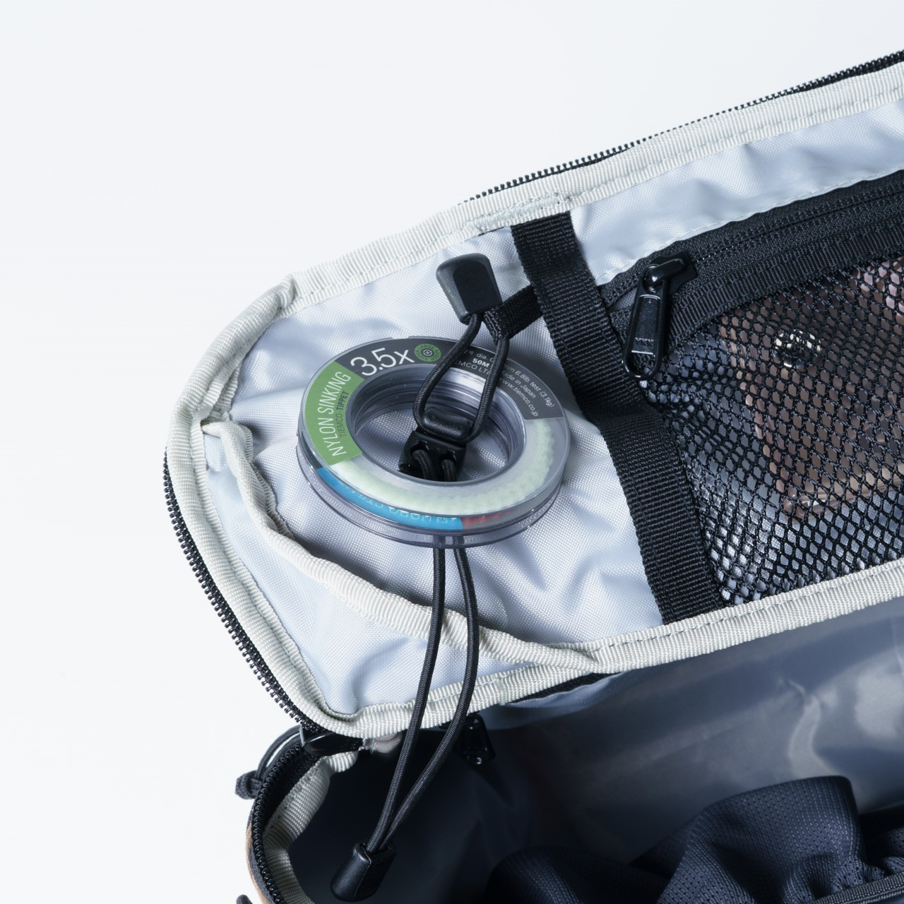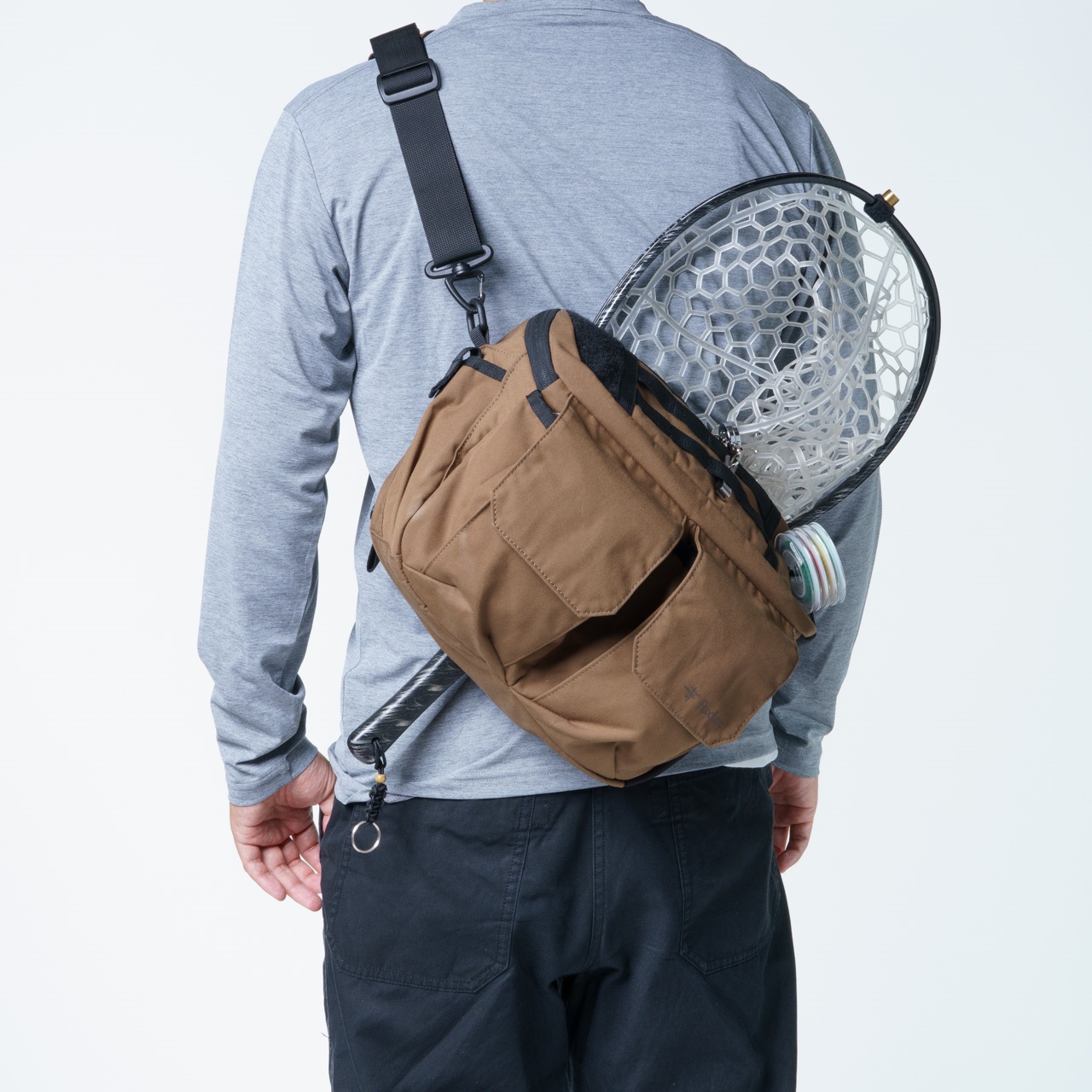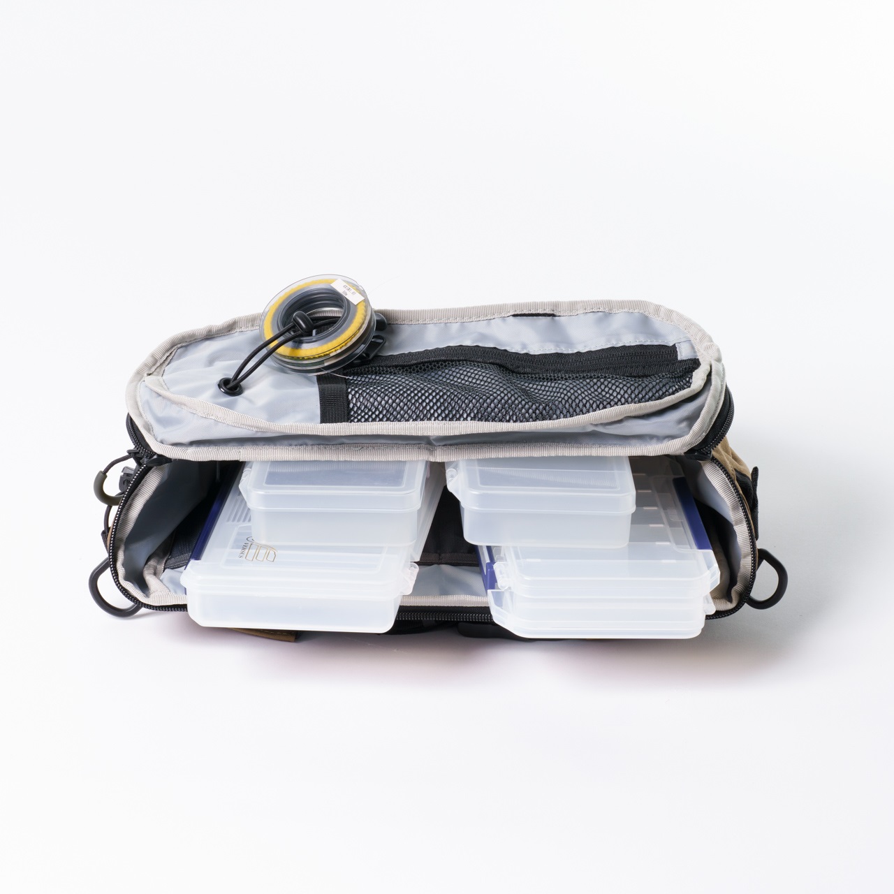 ショルダーバッグ、またはヒップバッグとしても使える2ウェイ仕様です。フロント部にはマチ付きのポケット、メイン気室内にはメッシュポケットを配し、ボックスや小物をシステマティックに収納可能。サイド部にはボトルポケット、プライヤーポケットを装備しています。タックルバッグ使用時に悩ましいランディングネットの持ち運び問題を解決すべく、背面にはランディングネット用スリットを設けました。