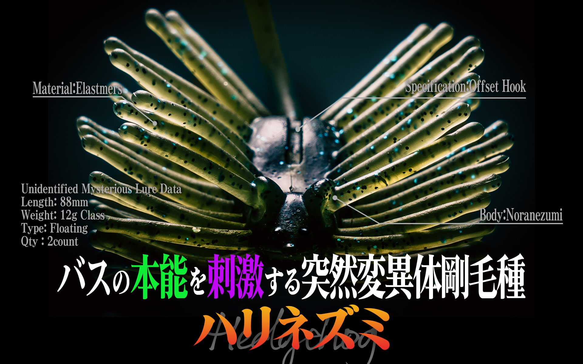 対カバー性能に特化した「剛毛エラストマー」。野良ネズミのボディは「根掛りしにくく」「フッキングが良い」形状であることは、数々の釣果で証明済み。この性能は、フッキングが悪くなりがちな、エラスマー製ルアーには極めて重要な要素です。そしてアクションは、毛の一本一本をわずかな水流で動くように長さと硬さを調整。驚くほど複雑なアクションを演出することができます。