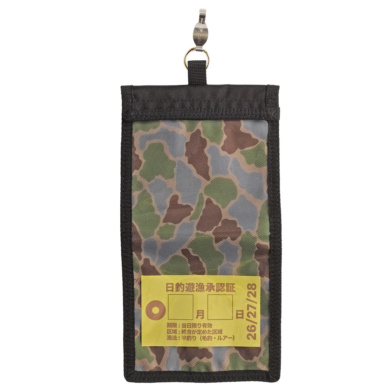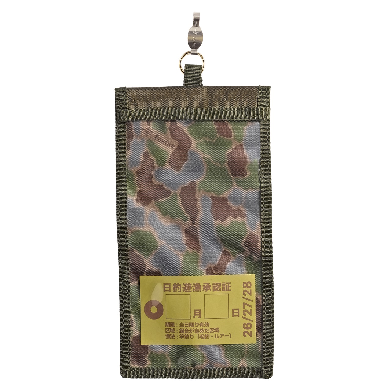 Foxfireオリジナルのフィッシュアイカモフラージュ柄をプリントした二つ折り形状のライセンスホルダー。日釣り券はもちろん、腕章タイプの年券も収納することができます。マルチクリップ付属で、Dカンが無くても様々な場所に取り付けが可能。