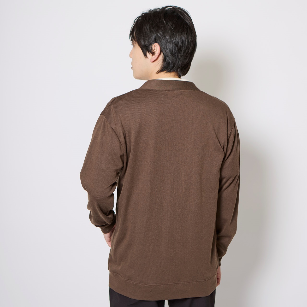 ポリエステル高混率ながら、ニット調の生地感で着用シーンを選ばないシンプルなカーディガン。高いストレッチ性と程よい生地厚で着心地に優れ、3シーズンに渡り着回しが可能です。