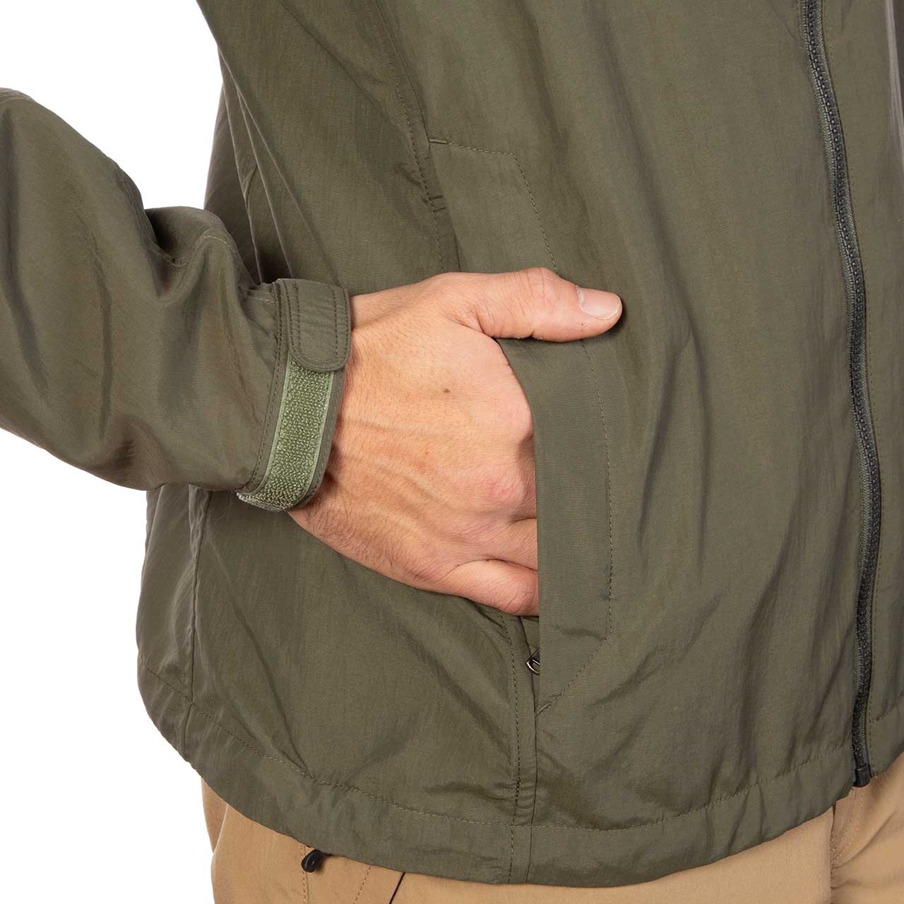 コットンライクな風合いのナイロンタッサーを使用した撥水ジャケット。フードは着脱式で、シンプル&スタンダードなデザインにより、トレッキングからトラベルまで幅広く活躍します。フードを利用してパックインすることができる新ロールパック方式を採用。