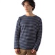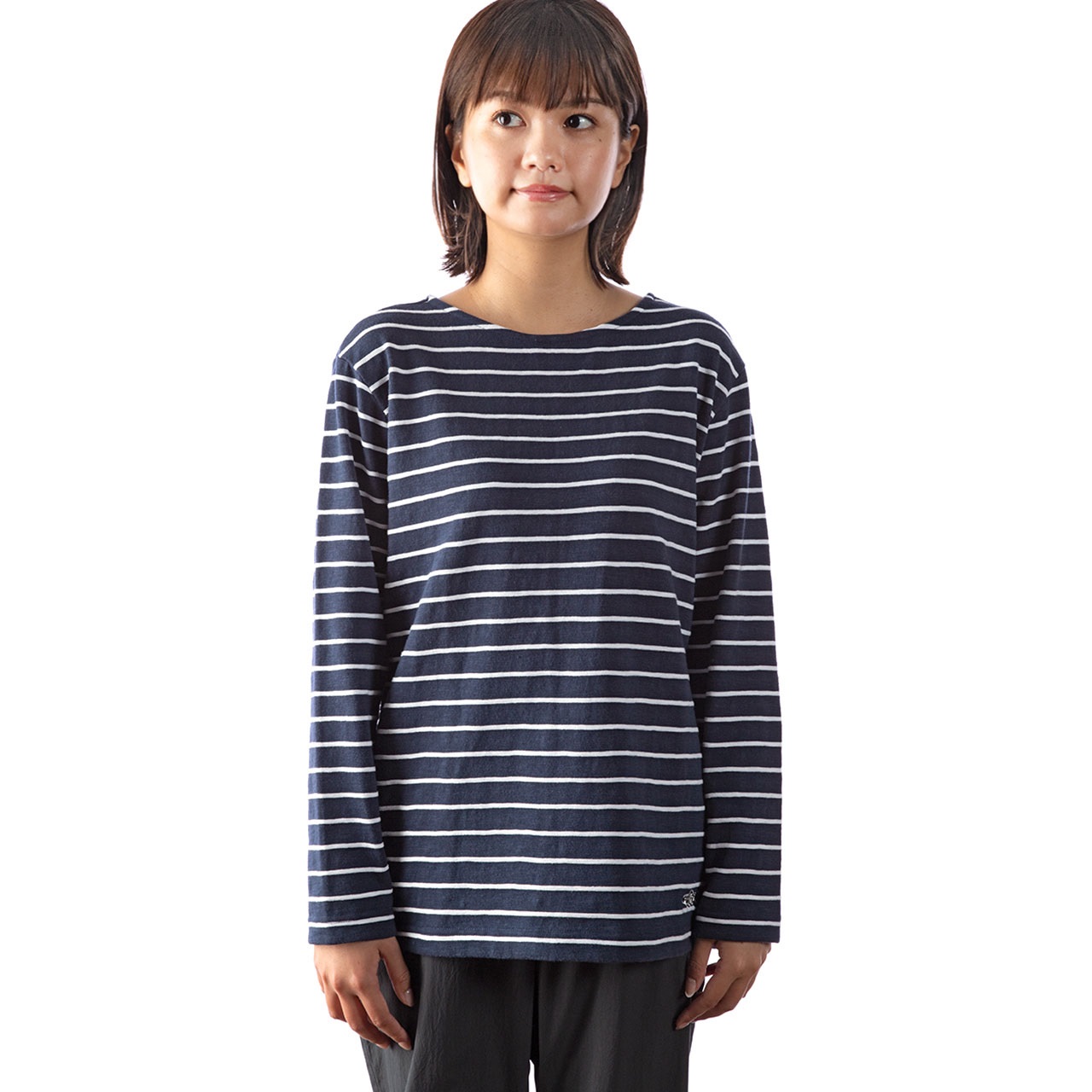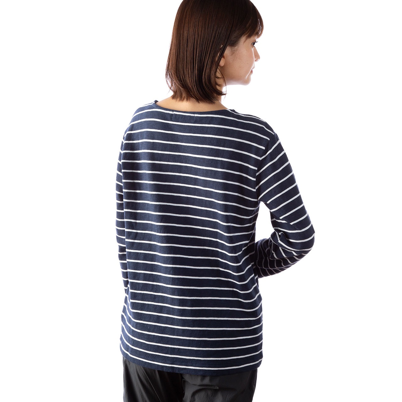 表面に綿のスラブ糸、肌面にポリエステル糸を使用した、カジュアル感と機能性を両立した素材のロングスリーブTシャツ。ユニセックス仕様のボーターデザインです。キャンプなどのフィールドからデイリーユースまで幅広いシーンで活躍します。左裾にFoxfireの文字で魚を模ったワンポイントのワッペン付き。