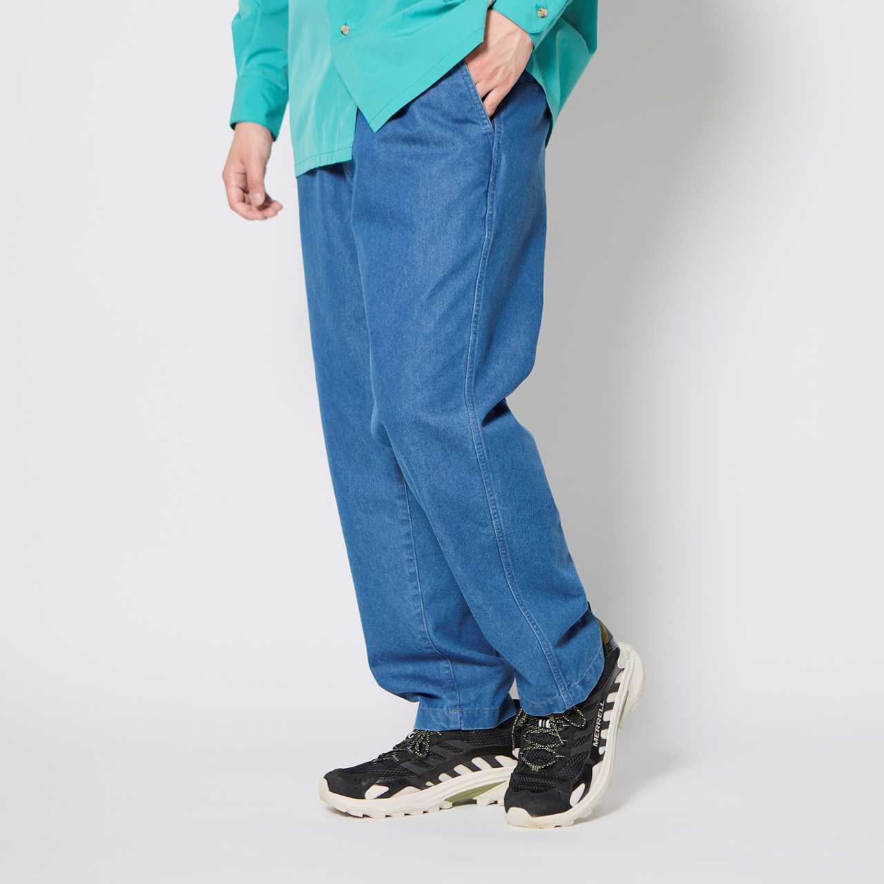 コットンタッチで速乾性に優れる異形断面ポリエステル糸「アロードライファイバー」素材のデニムパンツ。ウエストゴム紐のイージーパンツ仕様で、ヒップとわたりにゆとりがあるテーパードシルエットを採用しています。