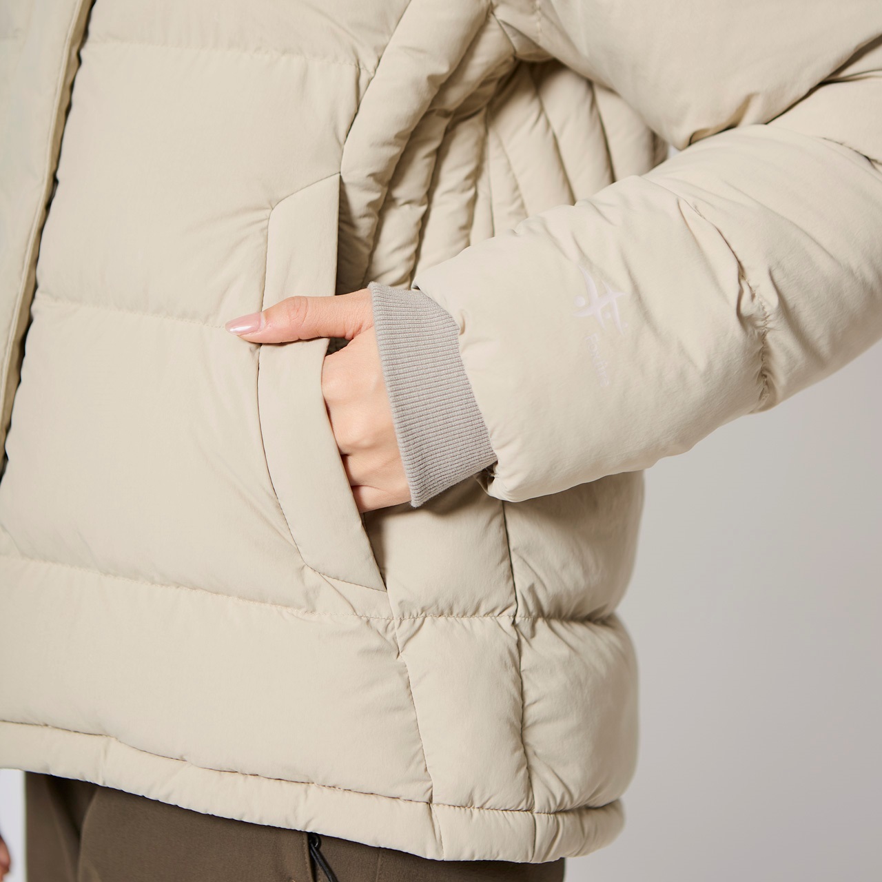 柔らかな風合いのハイマルチフィラメントの表地に、帝人フロンティアと共同開発の新素材「サーモフラッフィ」を封入したシンプルなデザインのインサレーションジャケット。超極細マイクロファイバーと中空糸をブレンドした粒綿でダウンボールを人工的に再現したサーモフラッフィは、ダウンと同等の暖かさや軽さ、嵩高性を持ちつつ、イージーメンテナンスというアウトドア衣料に最適なインサレーション素材です。ボリュームのある首周りと着膨れして見えないボディのバランスにこだわってデザインしました。