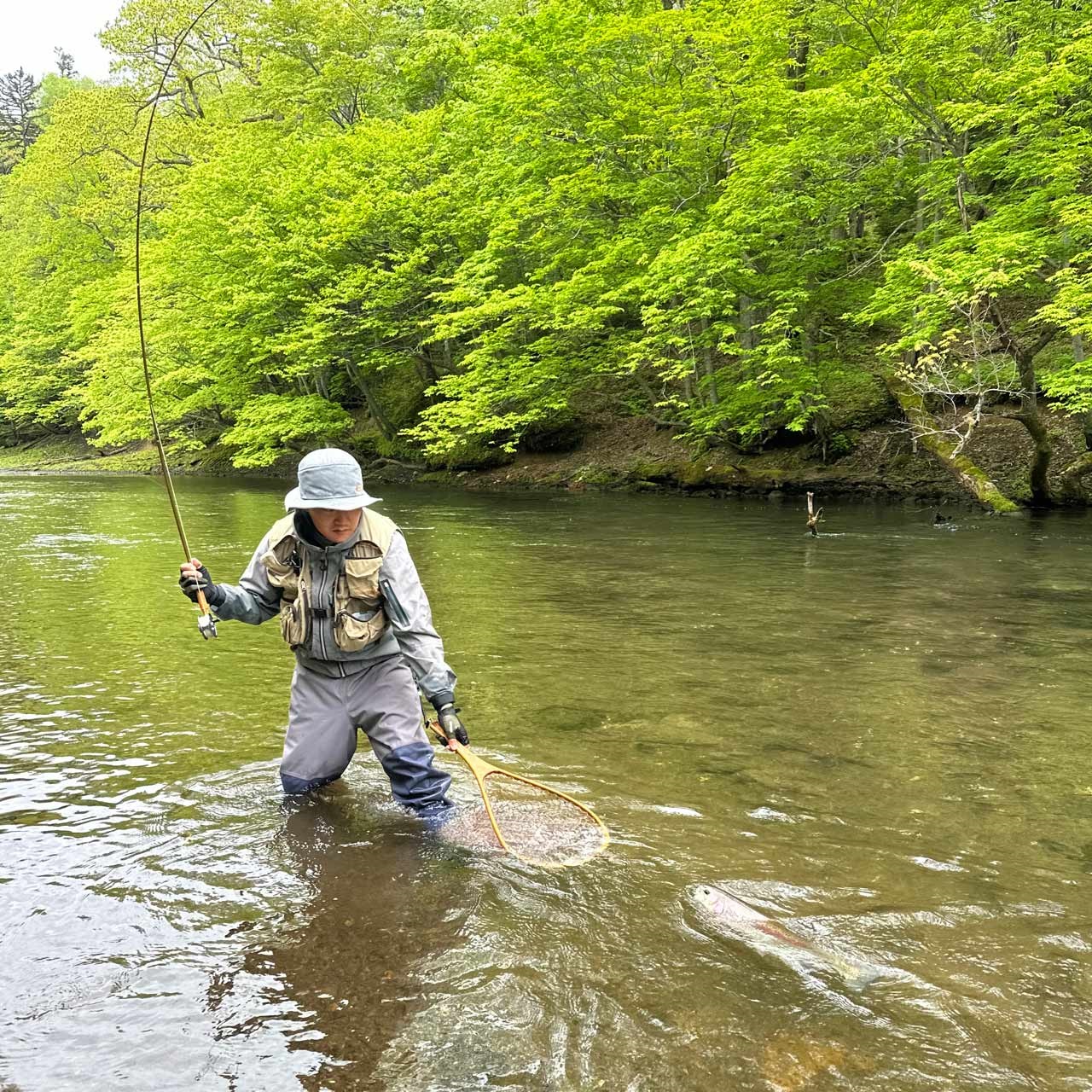 すばらしい環境の北海道阿寒川をティムコスタッフの案内で釣ります。カゲロウ、トビケラ等の状況に応じていろいろな釣り方でトライしていただきます。