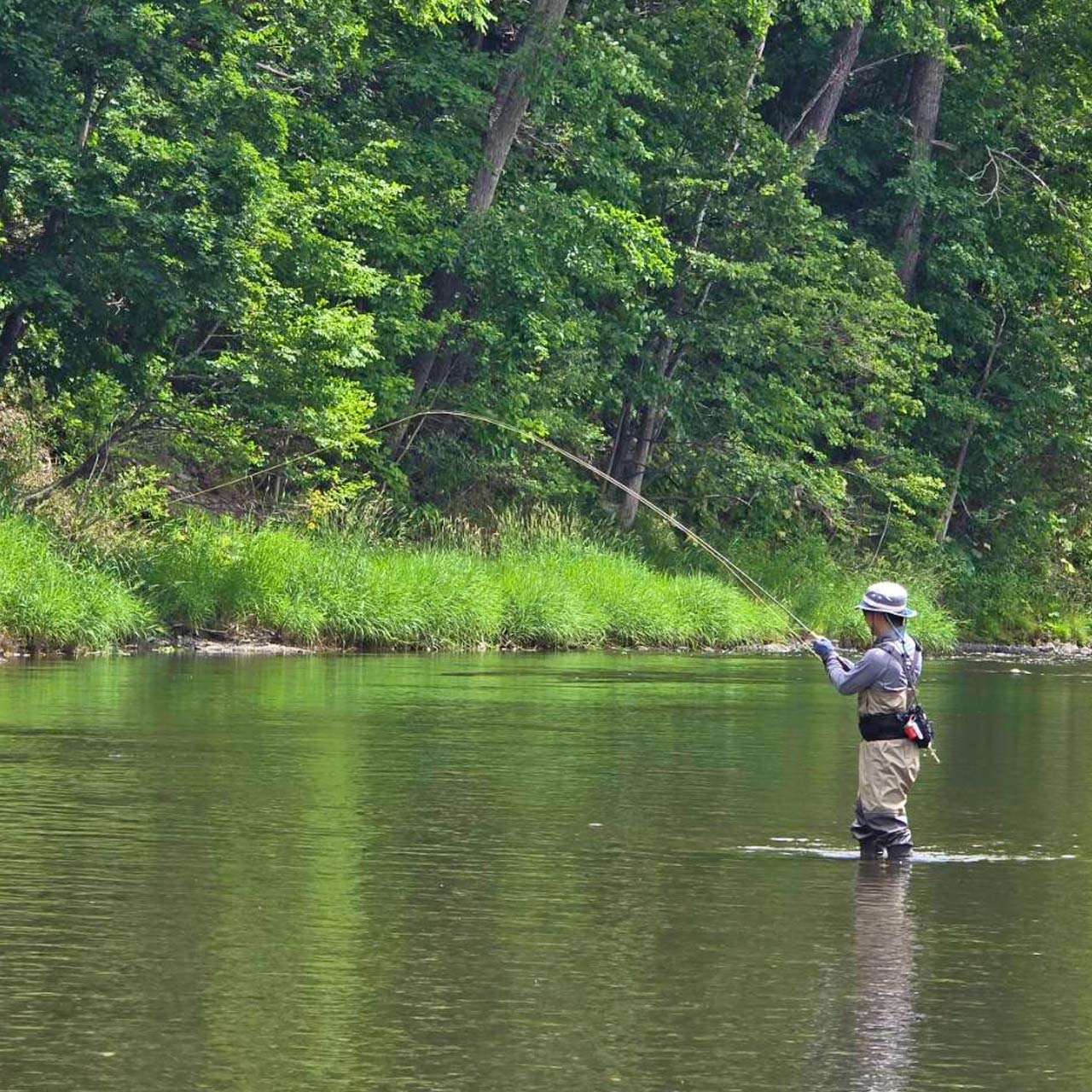 そんな頼りになる地元のサポートのもと盛夏の渚滑川でレインボーを狙います。ドライで釣るもよし、ニンフで釣るもよし、様々な表情を見せる長大なC&Rエリアを擁する渚滑川でフライフィッシングを楽しみましょう。