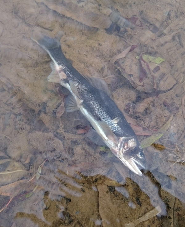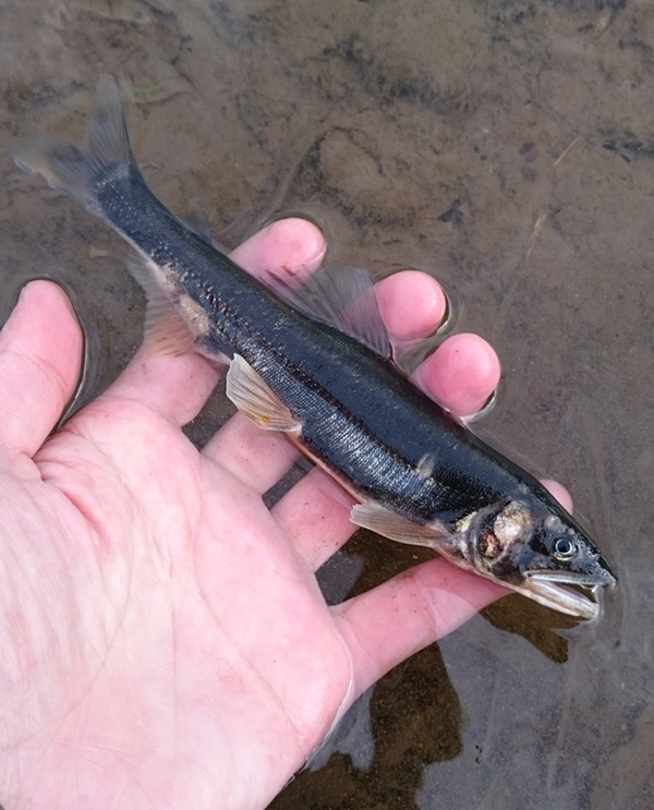 初秋の陽気の中、できたばかりのNEWアユパターンを携えて川縁に立っていました。と言うのも、普段釣りをしていても時折“死に体”となったアユが流れ下るのを見付けていて、それらがニジマスの重要なエサになっていることは想像に難しくなく、アユの産卵が始まっているのかを確かめるのも兼ねて、やって来ていました。
