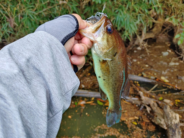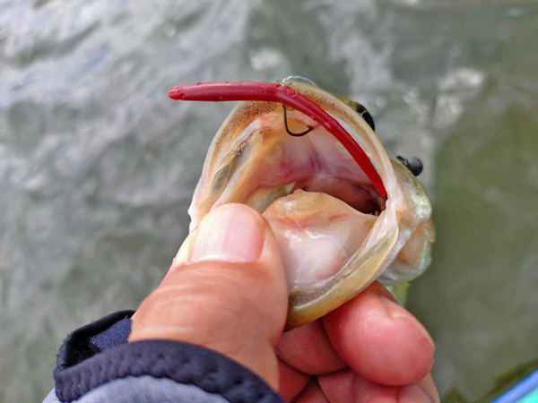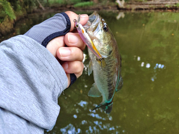 サイズアップをする為に角度のあるバンクに張り出しや沈み物があり、小さな稚魚が居るエリアを10gのフリーリグで狙い、これまた良く釣れました。フリーリグは張り出しに着底後や沈み物に当たった後、沈み物を超えた後などにバイトが多く、少しサイズは上がったものの更なるサイズアップを目指しました。