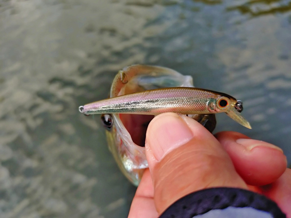 朝の水温24℃台で減水40センチ、事前情報では頻繁にボイルしているとの事で亀山ダムと言ったらレッドペッパーマイクロ!と思っていたのですがこの日は風が強く不発。ただ、少しレンジを下げてレヴァリエミノー55SPに変更すると数投でバイト!