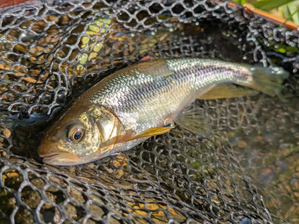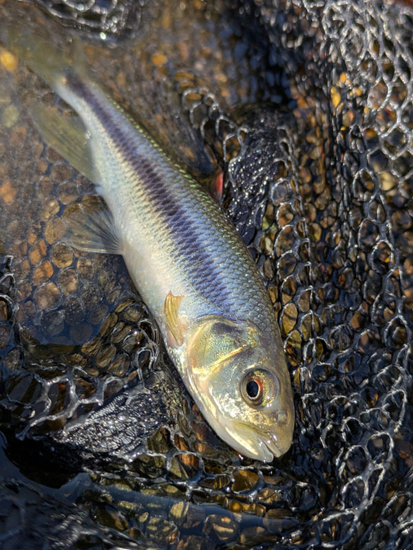 良いシーズンの時は飛んでいくルアーを追いかけていくヤツが居るくらいなのに今回は基本逃げていきます。苦戦しつつ何とか良さげな流れを流すと一匹目。