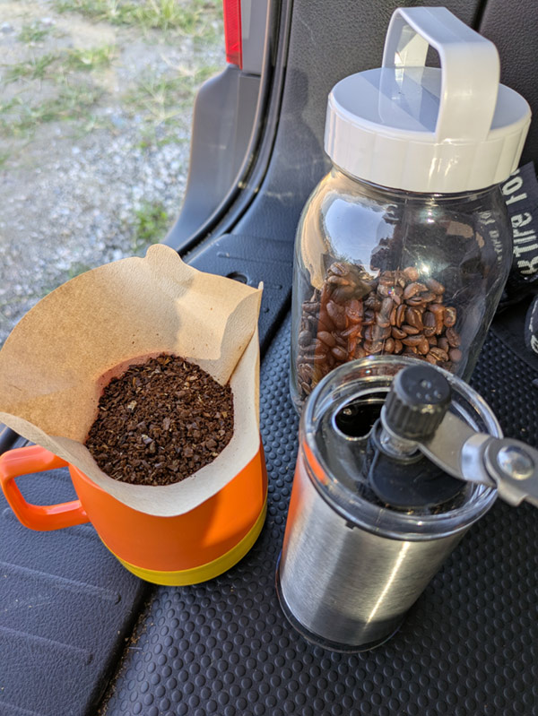 気分が良くなったので、車に戻りちょっと一服。何時ものコーヒーとは違い今回はちゃんと豆を挽こうとミルを持ってきました。ところがコーヒードリッパーを忘れると言う不覚!!直接カップにのせて淹れる事に・・・