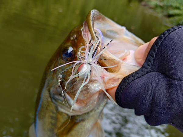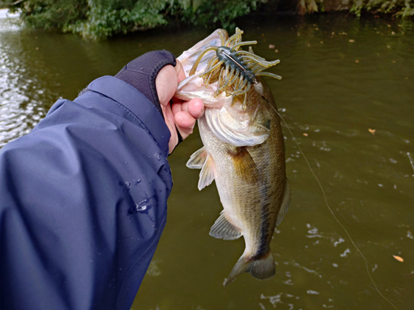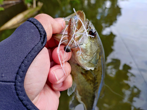 上流方面に向かいながらハリネズミのテキサスリグにはショートバイトのみなので、フォローでベイトフィネスジグ5gにギル系ワームを付けた物を投入してもバイトはありませんでした。