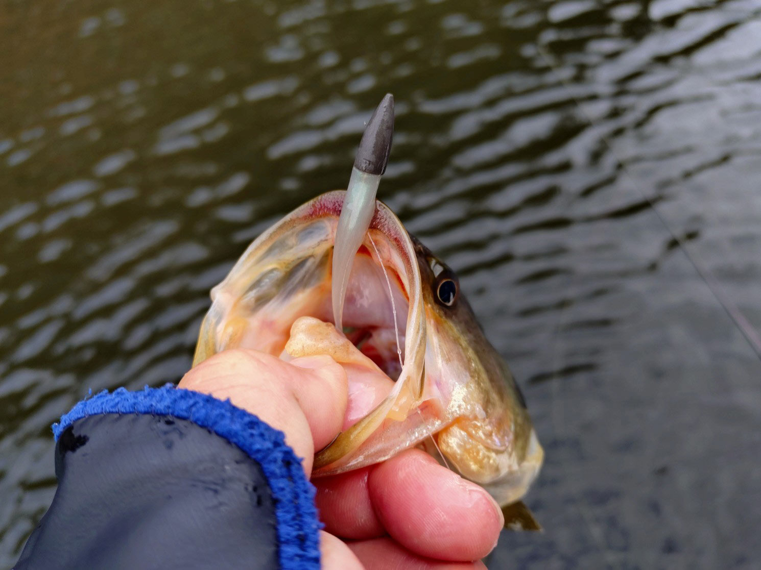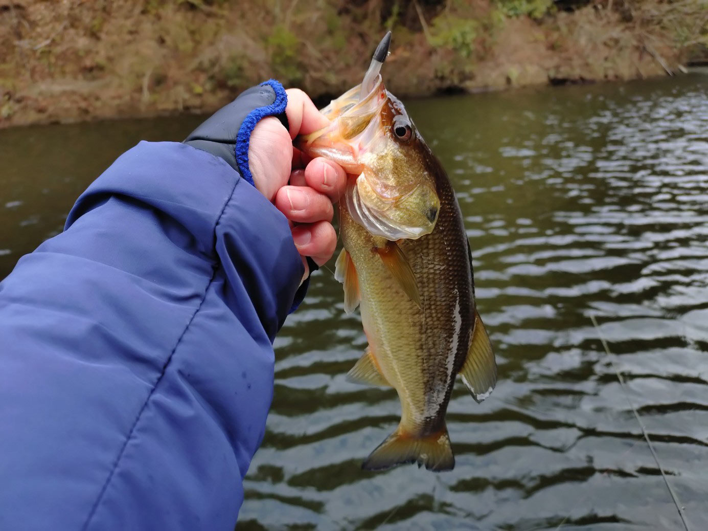 そろそろ最上流エリアでボケッーと日向ぼっこしてるバスも見えそうな時期ですが、風が強くなる予報だったので中流域のディープを狙いに行きました。